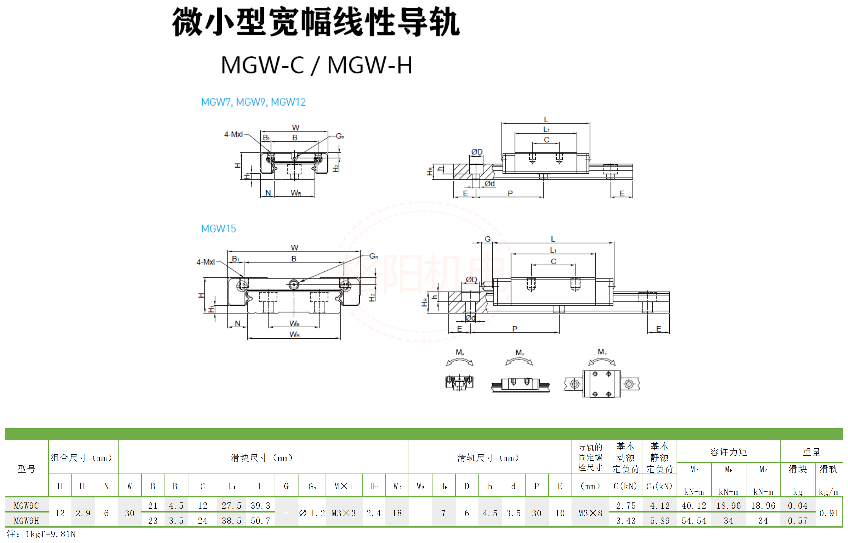 上银微小型线性导轨MGW9C系列特点:1采用哥德型四点接触设计,可承受各方向负荷,具备刚性强,精度高等特性。2 有钢珠保持器设计,在精度允许下具备互换性。MGN及MGW系列小型导轨的精度,分为普通C级、高H级、精密P级共三级,客户可依设备精度需求选用适合精度。