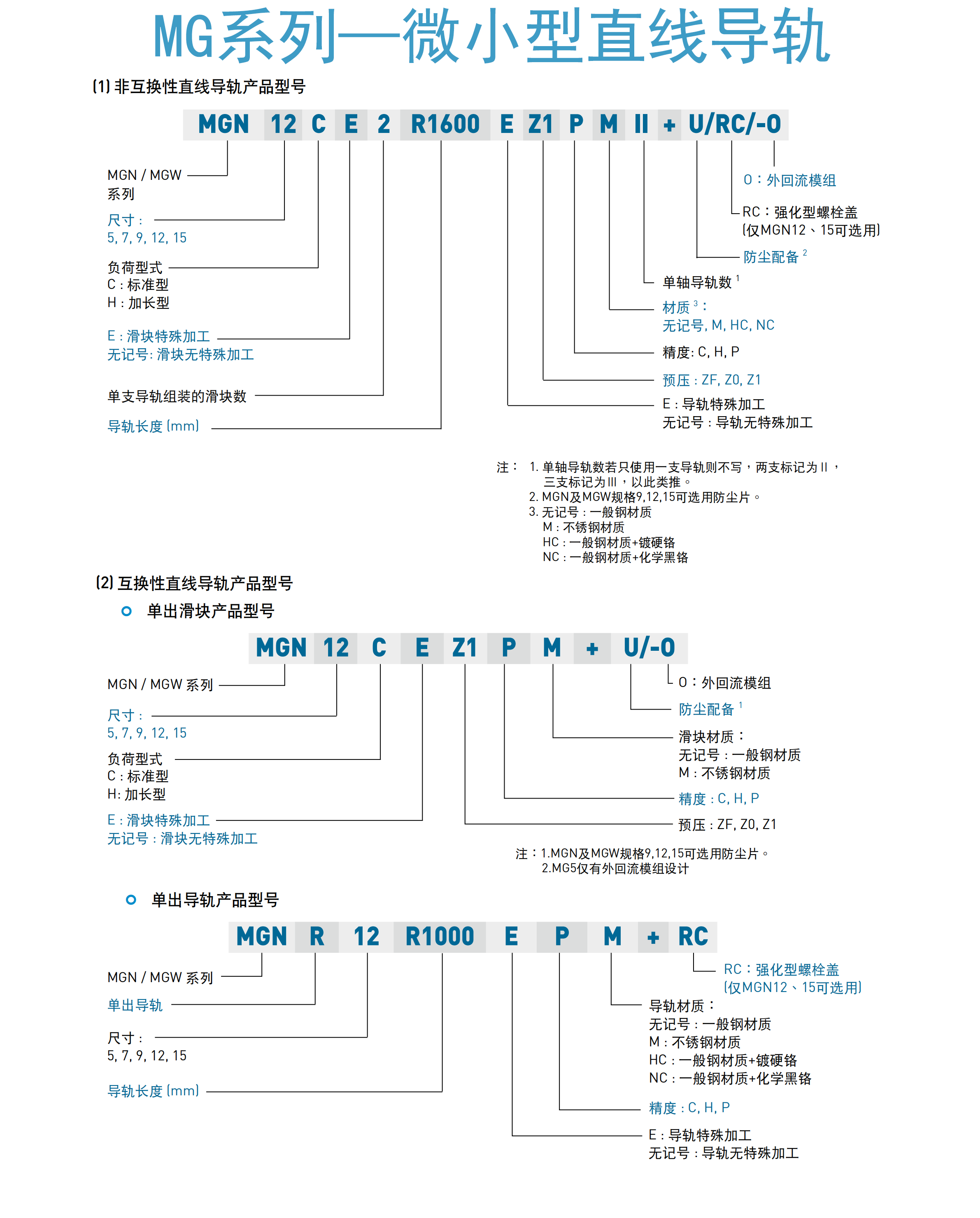 MGN系列非互换性型及互换性型两种直线导轨,两者规格尺寸相同,主要差异点在于互换性型之滑块、滑轨可单出互换使用,较便利,但其组合精度无法达到非互换性型之精度需求,不过由于HIWIN在制造上有良好的尺寸控制及严格的质量要求,互换性型之组合精度目前已达到一定的水平,对不需配对安装直线导轨的客户而言,是一项很好的选择。